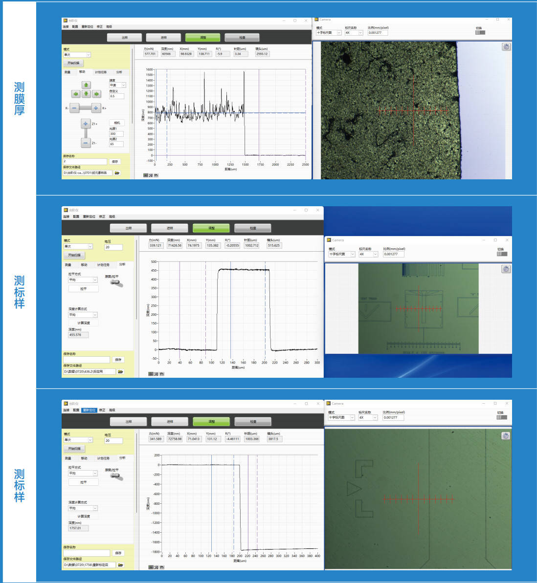 台阶仪: 台阶仪主要通过探测样品表面的微小高低台阶来测量表面形貌。它通常使用扫描探针(如激光或原子力显微镜)在样品表面移动,通过测量探针的位置变化来获取表面的高度信息。