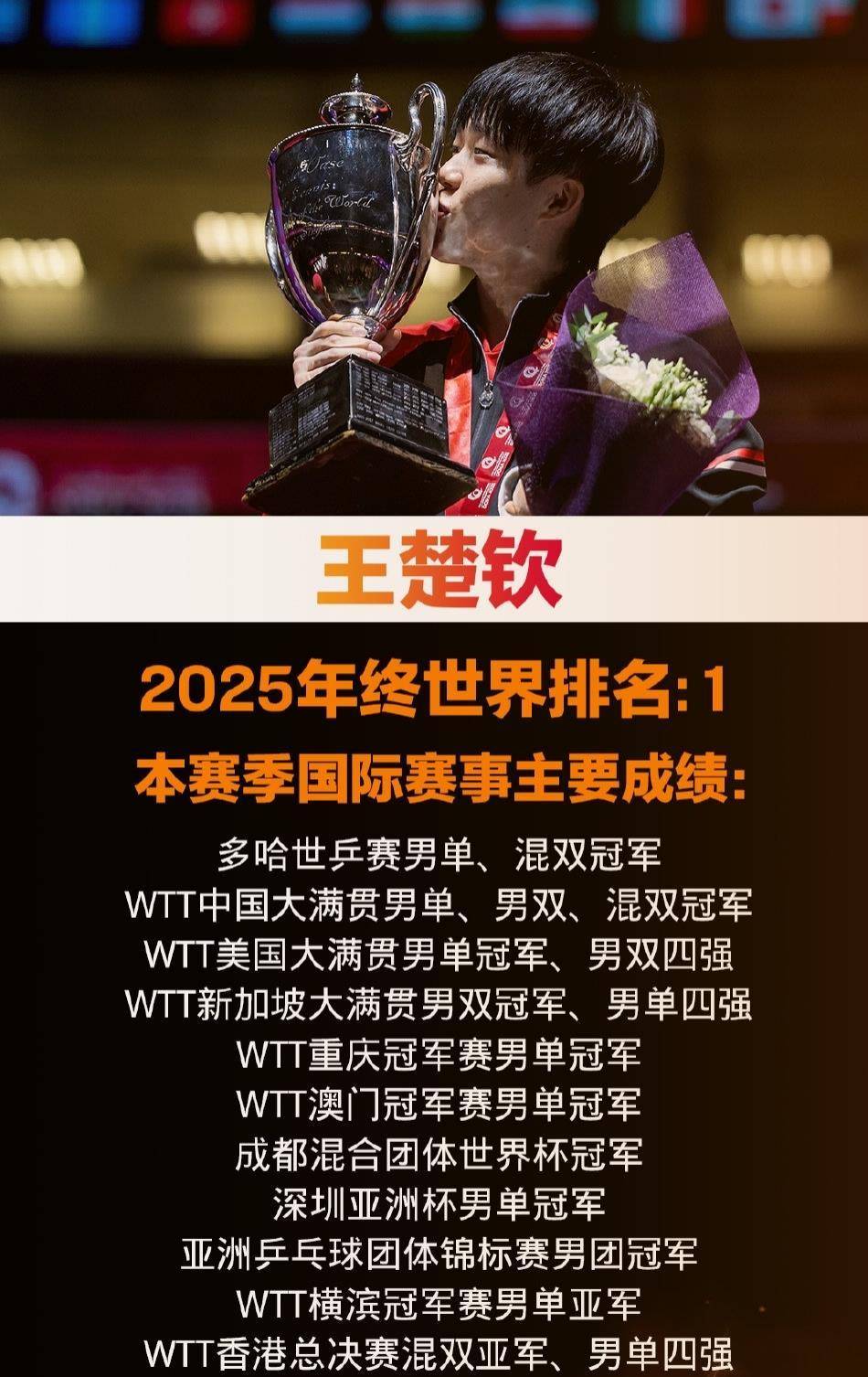 王楚钦在2025年表现出色,全年豪取15座奖杯,其中包括世乒赛、大满贯等6个重量级单打冠军,单打胜率高达94.3%,成为新积分规则下首位突破万分的选手,以年终世界第一收尾。 十二月底的乒超总决赛上,他率领山东魏桥队3比0横扫黄石华新卫冕成功。